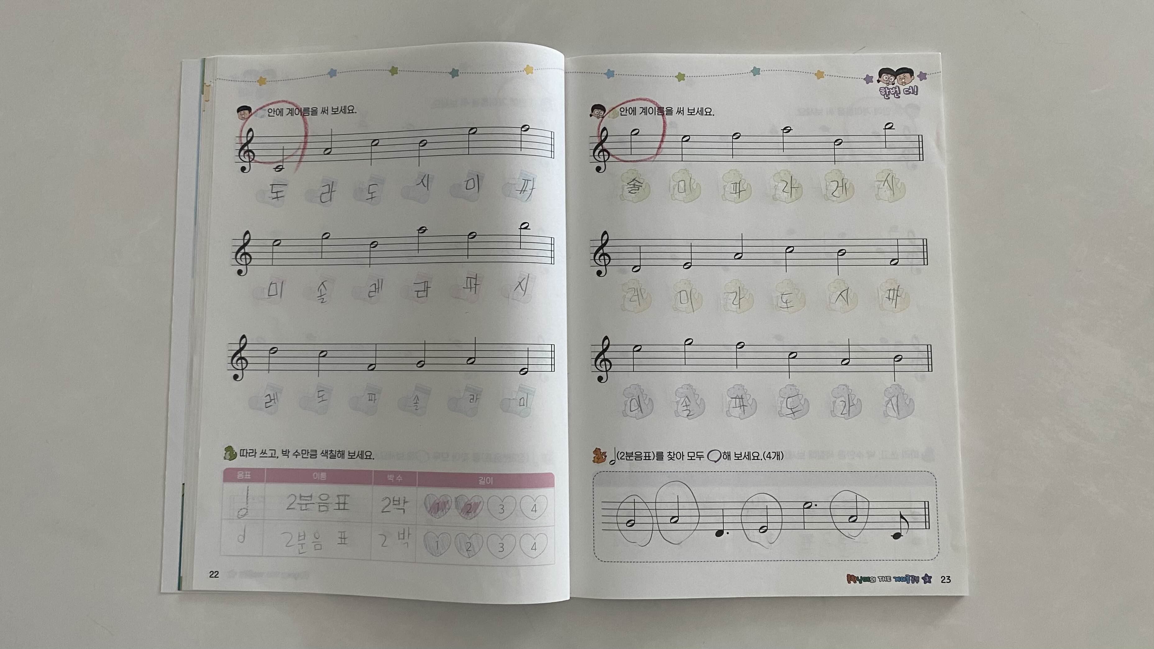 아이는 흔한남매를 좋아한다. 흔한남매에 대한 흥미를 발단으로 초등학교 1학년 때부터 <흔한남매의 더 계이름 공부> 학습을 시작했다. 초등학교 2학년이 된 지금, 1년 동안 1권에서부터 7권까지를 학습했다. 학습 내용은 아래와 같다.